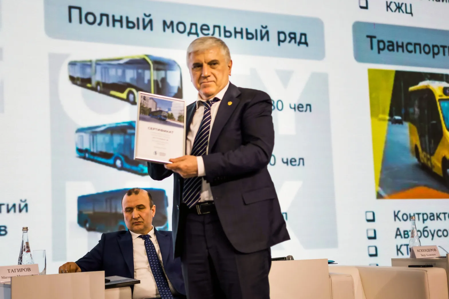 Накануне в рамках республиканской конференции по развитию общественного транспорта состоялась официальная передача сертификата на право тестирования автобуса. Документ вручили главе столицы Дагестана Юсупу Умавову.
